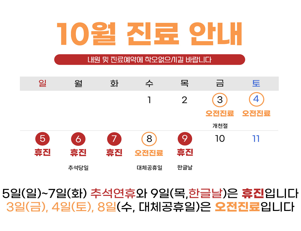 5일(일)~7일(화) 추석연휴와 9일(목,한글날)은 휴진입니다.3일(금), 4일(토), 8일(수, 대체공휴일)은 오전진료입니다.